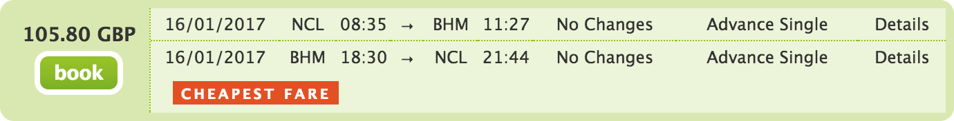 But is going by train really that expensive? I cynically assumed the £105 price quoted must apply to a stupid walk-up “anytime” ticket. If you book in advance – which is a bit fiddly, but no harder than jumping through hoops to get a cheap flight – it’s much cheaper, right? Actually, no: the cheapest return fare I could find from Newcastle to Birmingham was indeed £105.80 for two inflexible advance singles.