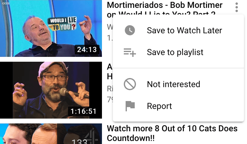 The eagle eyed will notice that the “Not interested” button there is attached to a lovely compilation of Bob Mortimer’s appearances on the televised parlour game Would I Lie To You?, in which I am not not interested. I couldn’t find any examples of actual Nazis for the screenshot, because one small nudge was all it took for the mighty algorithm to buck its ideas up and stop trying to radicalise me.